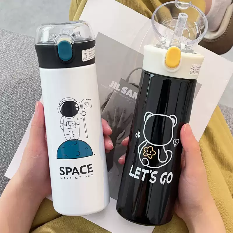 Bình giữ nhiệt Moon Light cao cấp, dạng cốc thẳng, hoa văn trang trí hình phi hành gia, Black Bear, Star, phối 2 màu trắng đen sang trọng